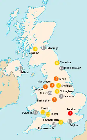 | 16 | Leicester (745,000) | Leicester (442,000) • Loughborough (53,000) • Coalville (39,000) • Hinckley (20,000) |