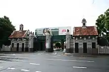 The public face of the racecourse is provided by the Federation style ticket offices and decorative wrought iron gates in Lancaster Road, terminating the view down Racecourse Road (1913). These structures consist of brick walls with an upper section (above sill height) of rendered bands above a face brick base and gabled terracotta tiled roofs with large eaves supported on corbels and central ridge ventilators. Either side of the ticket buildings are timber gates and beyond these are low level stone retaining walls extending approximately 70 metres (230 ft). The members' car park is located at the corner of Lancaster and Kitchener roads on a parcel of open grassed land which includes a number of mature trees.[1]