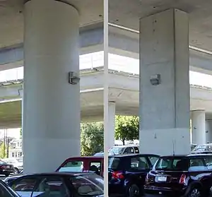 One simple retrofit is to surround the column with a jacket of steel plates formed and welded into a single cylinder. The space between the jacket and the column is then filled with concrete, a process called grouting. Where soil or structure conditions require such additional modification, additional pilings may be driven near the column base and concrete pads linking the pilings to the pylon are fabricated at or below ground level. In the example shown not all columns needed to be modified to gain sufficient seismic resistance for the conditions expected. (This location is about a mile from the Hayward Fault Zone.)