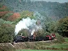 East Broad Top Railroad doubleheader with two Mikado locomotives, October 1987