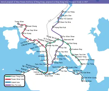 Freeman, Fox, Wilbur Smith & Associates published a new report on MTR construction in 1970, with the original Sha Tin line cut back from Sha Tin to Diamond Hill to become East Kowloon line (now part of Tuen Ma line), and extended across the harbour from Tsim Sha Tsui to Sheung Wan.