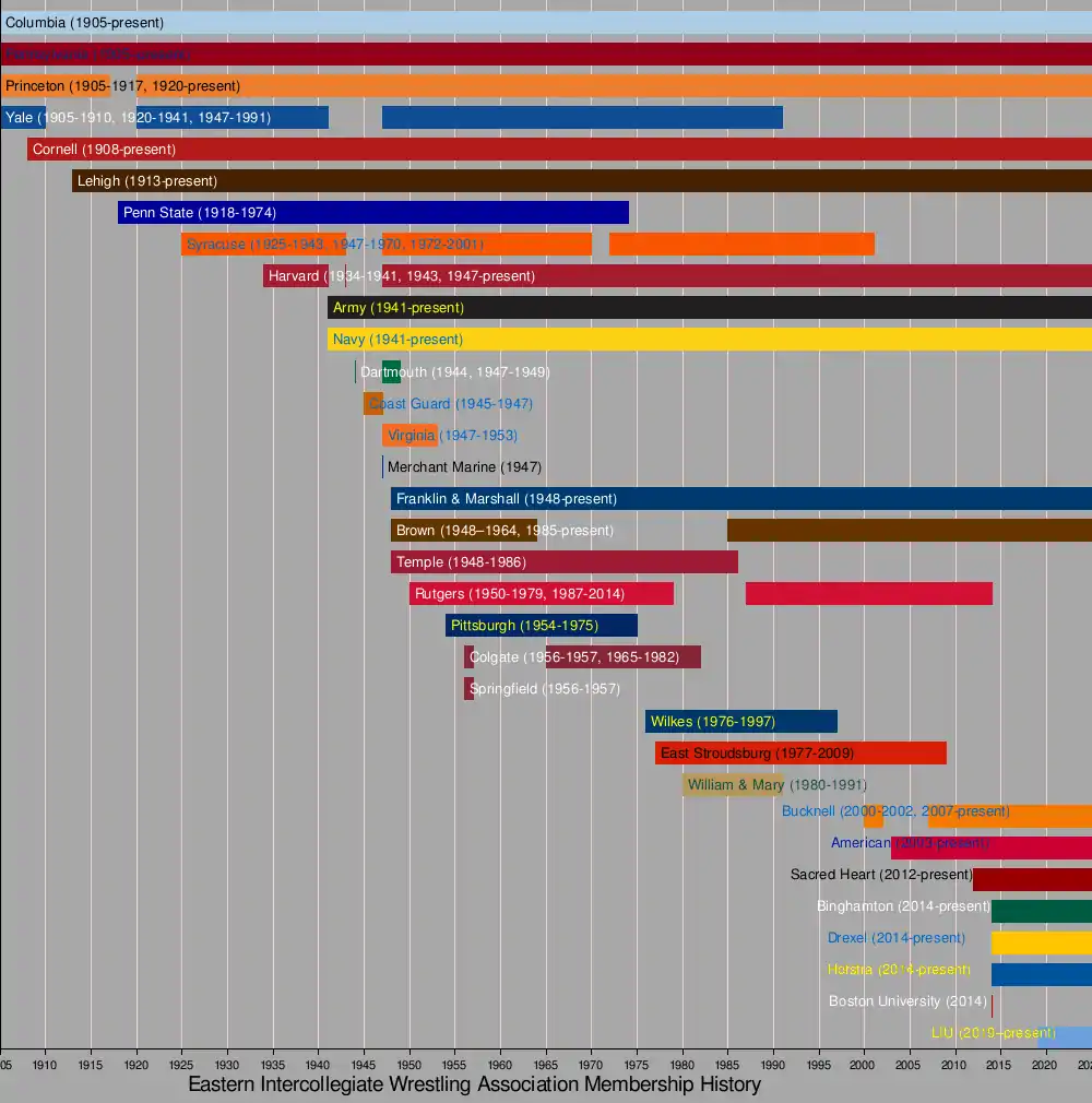 In 2013, the EIWA absorbed Boston University, Hofstra, Drexel, and Binghamton after the Colonial Athletic Association ceased sponsorship of wrestling, making an 18-team conference for the 2013–14 season.[11] The EIWA was reduced to 16 in 2014-15 with the departure of Rutgers to the Big Ten Conference[12] and discontinuation of the BU program.[13]