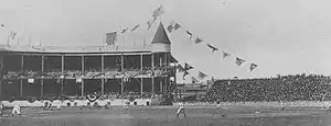 It was originally the home of the Brooklyn Ward's Wonders of the Players' League in 1890.[2] After the one-year Players' League experiment, the park became the part-time home of the Brooklyn Dodgers in 1891 and then full-time during 1892–1897, between their stints at the two versions of Washington Park. Some sources erroneously say that it is here that the nickname "Trolley Dodgers", later shortened to "Dodgers", first arose, due to the need for fans to cross various trolley lines to reach the ballpark. Although the Dodgers played at Eastern Park in 1895 when the name "Trolley Dodgers" was first used, the name was based on the dangers of trolleys in Brooklyn, generally, and not trolley lines that needed to be crossed to get to the game.[3] There were no trolley lines near Eastern Park at the time.[4]