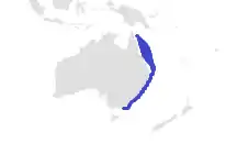 Pacific: eastern Australia. Found between Cairns, Queensland and Lakes Entrance, Victoria. 17°S - 38°S.