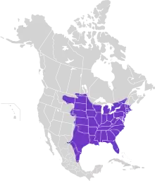 Eastern screech owls inhabit open mixed woodlands, deciduous forests, parklands, wooded suburban areas, riparian woods along streams and wetlands (especially in drier areas), mature orchards, and woodlands near marshes, meadows, and fields. They try to avoid areas known to have regular activity of larger owls, especially great horned owls (Bubo virginianus). Their ability to live in heavily developed areas outranks even the great horned and certainly the barred owl (Strix varia); screech owls also are considerably more successful in the face of urbanization than barn owls (Tyto alba) following the conversion of what was once farmland.[4] Due to the introduction of open woodland and cultivated strips in the Great Plains, the range of eastern screech owls there has expanded.[4] Eastern screech owls have been reported living and nesting in spots such as along the border of a busy highway and on the top of a street light in the middle of a busy town square. They often nest in trees in neighborhoods and urban yards inhabited by humans. In such urban environments, they often meet their dietary needs via introduced species that live close to humans such as house sparrows (Passer domesticus) and house mice (Mus musculus).[4] They also consume anole lizards and large insects such as cicadas. They occupy the greatest range of habitats of any owl east of the Rockies. Eastern screech owls roost mainly in natural cavities in large trees, including cavities open to the sky during dry weather. In suburban and rural areas, they may roost in manmade locations such as behind loose boards on buildings, in boxcars, or on water tanks. They also roost in dense foliage of trees, usually on a branch next to the trunk, or in dense, scrubby brush. The distribution of the species is largely concurrent with the distribution of eastern deciduous woodlands, probably discontinuing at the Rocky Mountains in the west and in northern Mexico in the south due to the occupation of similar niches by other screech owls and discontinuing at the start of true boreal forest because of the occupation of a similar niche by other small owls (especially boreal owls (Aegolius funereus). Eastern screech owls may be found from sea level up to 1,400 m (4,600 ft) in elevation in the eastern Rocky Mountains and up to 1,500 m (4,900 ft) in the eastern Sierra Madre Oriental Mountains, although their altitudinal limits in the Appalachian Mountains, near the heart of their distribution, is not currently known.[4][8]