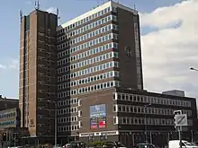 Eastgate House (also known as Heron House) is a high-rise office building on the corner of Newport Road and City Road, Cardiff, Wales, next to Longcross Court and near Holland House. It was built in 1969 and is 46 metres (151 ft) high, with 14 floors.[1] It is (or has been) occupied by the Wales Office,[2] Department for Work and Pensions,[3] Cardiff University,[2] Newsco Insider, Biofusion Plc, BPP Professional, Asthma UK and Randstad Holding.[4] The office building contains 3 elevators and has parking space for 40 cars.