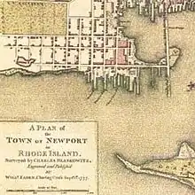 Goat Island and Easton's Point with Long Wharf on the right before the marsh was filled in (1777 Newport map)