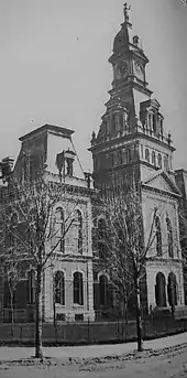 Ebensburg originated in November 1796, when Congregational minister Rees Lloyd led a small party of 20 Welsh people from Philadelphia to the lands Morgan John Rhees had chosen for his colony. They selected an attractive spot in the tops of the Allegheny Mountains and there settled what would become Ebensburg, naming it for Eben Lloyd, who died in childhood.[9] Lloyd offered land to the government in exchange for Ebensburg becoming the county seat, which the government accepted. A nearby settlement by the name of Beula, Pennsylvania sprouted just to the West of town with intentions of becoming the county seat. The town faded into obscurity and now all that remains is an old cemetery. Ebensburg was described in the 1940 Pennsylvania guide as being:[10]
