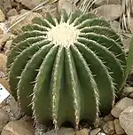 Echinocactus platyacanthus, also known as the giant barrel cactus, golden barrel cactus, giant viznaga, or biznaga de dulce,[2] Its Nahuatl (Aztec) name is Huitzli nahual. It is a species of cactus (family Cactaceae). It is native to central Mexico in the Chihuahuan Desert.[1] This species is the largest of the barrel cacti. In Mexico the hairs are often used for weaving; the acitrón, a traditional Mexican candy, is produced by boiling the pith.