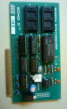 The Echo II is a plug-in expansion card, speech synthesizer card for the Apple II and Apple IIe personal computers that allow applications to use speech synthesis.[1] The Echo II provides a speaker/headphones jack on board, with a physical volume control adjustment.