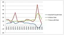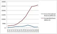 After experiencing years of positive growth, the Philippine economy between 1973 and 1986 suffered a downturn due to a mixture of economic mismanagement and political instability amidst a global economic recession. After the 1972 Martial Law declaration, Marcos continued his strategy of relying on international loans to fund the projects that would support the booming economy, prompting later economists to label this a period of "debt driven" growth.[59] Massive lending from commercial banks, accounting for about 62% percent of external debt, allowed the GDP of the Philippines to rise during martial law.[60] Much of the money was spent on pump-priming to improve infrastructure and promote tourism. However, despite the aggressive borrowing and spending policies, the Philippines lagged behind its Southeast Asia counterparts in GDP growth rate per capita. The country, in 1970–1980, only registered an average 5.73 percent growth, while its counterparts like Thailand, Malaysia, Singapore, and Indonesia garnered a mean growth of 7.97 percent.[54] This lag, which became very apparent at the end of the Marcos Regime, can be attributed to the failures of economic management that was brought upon by State-run monopolies, mismanaged exchange rates, imprudent monetary policy and debt management, all underpinned by rampant corruption and cronyism.[54]