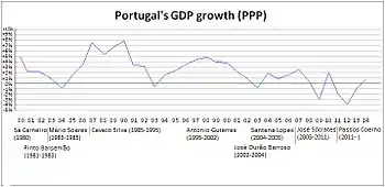 In 1960, Portugal's per capita GDP was only 38 percent of the EC-12 average.[48] After Salazar's late[49] shift in economic policy toward a more outward-looking, economically liberal direction due to the influence of a new generation of technocrats with background in economics and technical-industrial know-how, by the end of the Salazar period, in 1968, it had risen to 48 percent; and in 1973, on the eve of the revolution, Portugal's per capita GDP had reached 56.4 percent of the EC-12 average.[50] In 1975, the year of maximum revolutionary turmoil, Portugal's per capita GDP declined to 52.3 percent of the EC-12 average. Convergence of real GDP growth toward the EC average occurred as a result of Portugal's economic resurgence since 1985. In 1991 Portugal's GDP per capita climbed to 54.9 percent of the EC average, exceeding by a fraction the level attained just during the worst revolutionary period. Portugal overtook Greece in terms of GDP per capita in 1992, but fell again below it in 1993. This situation endured until 2013 when Greece was more hardly hit by economic fallout from debt crisis.[51]