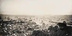 The absolute value of the exports of the Empire in 1850 was the highest in Latin America (triple that of Argentina, which was in fourth place); Brazil would keep this position in this respect and in general economic terms until the end of the monarchy.[22] Brazil's international trade, that is, the sum of both its imports and exports, amounted to a total value of Rs 79.000:000$000 between 1834 and 1839 and increased every year until it reached Rs 472.000:000$000 in 1886 (an annual growth of 3.88% since 1839). In 1859 the balance of payments between imports and exports reached equilibrium; exports gradually increased relative to imports, and the Empire's balance of trade became consistently positive from 1865 on. After 1874, the balance of payments became clearly favorable. Most Brazilian exports were agricultural goods.[23] For comparison, between 1850 and 1900 agricultural goods constituted between 73% and 83% of the United States' total exports.[24] Economic growth was perceived in the Brazilian Gross Domestic Product (GDP), which from circa 50.000:000$000 in 1840, reached a figure of 500.000:000$000 in 1889 (an annual growth rate of 4.81% since 1840).[2] Brazilian economic growth, especially after 1850, compared "very well" with that of the United States and European countries, according to the historian Boris Fausto.[25] In the last year of the monarchy, Brazil was a "prosperous and [internationally] respected" country, according to historian Oliveira Lima.[26] Historian Heitor Lyra wrote that:[27]