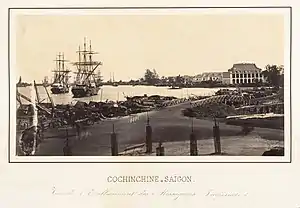The main exports of the Kingdom of Vietnam came from agricultural products such as rice, salt, sugar, silks.[28] Minh Mạng's view on trade was "unnecessary for his self-sufficient economy" and once considered "trade was merely a favour conferred upon deserving barbarians."[29] However, Vietnamese state-owned ships frequently sailed to Singapore, Macao, Luzon, and Bengal to trade. Vietnamese annual rice exports to British Singapore had jumped from $147 million in 1821 to $2 billion in 1865.[30] The decrease of the latter value was caused by the French seizure of the lower Mekong, failed crops, and rapid population growth. Trade with Britain was also under state control, and trading ships were ships of the Emperor.[31] The kingdom's main imports were manufactured goods, opium, and tea.[5] Opium during 1840–44 counted for 59% value of total imports of Vietnam, while cotton made up 22%.[32] Opium consumption and exports in the Mekong Delta generated 500,000 francs in 1862 to 6.7 million francs in 1881, which became the main revenue for the new French administration.[33] Commerce in French Saigon reached $21 million US Dollar in 1882, with China and British Singapore being largest exporters ($3.2 and $3.1 million). In the port of Saigon, France accounted for 6 sailing ships and 31 steamers, Britain held 11 sailing ships, 208 steamers, and Germany owned 62 steamers. Hanoi was the busy trading city in the north. After the treaty of 1874, port cities of Haiphong and Quy Nhon were opened for trade with the world.[34][35] According to Mongolian-born Australian historian Li Tana, 19th-century Vietnamese commerce by the time of the French conquest, had been linking with the global economy.[36]