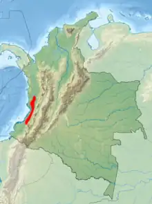 Ectopoglossus lacrimosus is a species of frog in the family Dendrobatidae. It is endemic to western Colombia where it is known from the drainage of Atrato River, San Juan River, and Guanguí River.[2] It is a very rare frog found along streams in lowland and foothill forests and may be declining from threats such as deforestation for agriculture (including illegal crops), logging, human settlement and pollution from spraying of illegal crops. The only conservation measure known is that it occurs in Parque Nacional Natural Farallones de Cali.[1]