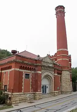 Cincinnati city officials began to build the Eden Park Station in 1889,[2]: 593 with construction overseen by the David Hummel Construction Company,[2]: 593 but five years passed before it was completed. The station formed part of the city's water supply network, raising water from the nearby Ohio River and moving it into the Eden Park Standpipe, which was finished in the same year as the pumping station. When built, the station was able to move 16 million US gallons (61 Ml) of water with Snyder and Holly pumps, but only for a few years did the network operate as designed. A new station in the East End opened in 1907 to replace the stations in Eden Park and on Front Street downtown; contamination in the nearby Deer Creek,[2]: 593 which by this time had been converted into a sewer,[3] was severe to the point that the nearby waters of the Ohio River were polluted to an unsafe extent. After years of little use, the station was restored to usefulness in 1939, as its tower was converted into a radio station for police purposes.[2]: 593