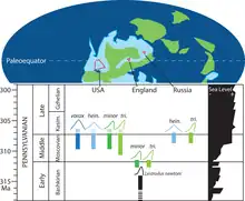 13 species of Edestus have been named, but in a 2019 morphometric analysis only 4 were considered valid, which span a six million year interval in the Late Carboniferous (313-307 million years ago). Species of Edestus are divided into two groups, those which have asymmetrical crowns that slant forwards, and those with symmetrical ones. The earliest known species are from the late Bashkirian of the United Kingdom, with the first appearances in Russia and the United States during the Moscovian, corresponding to a rise in sea level.[4] These localities were situated in paleoequatorial tropical latitudes. Most remains of Edestus are found in marine shales that overlie coal swamp deposits as a result of marine transgression events.[4]