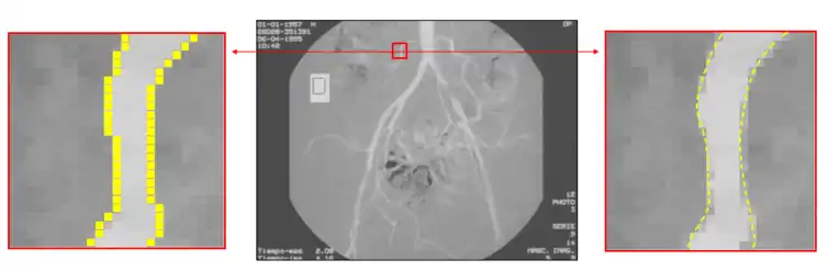 Edge detection on an angiographic image. On the left, edge detection is made at a pixel level. On the right, subpixel edge detection locates the edge inside the pixel precisely