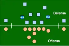 One reason the word "edge" is used in the term "edge rusher" is that edge often refers to the area outside of offensive tackles, but within a couple of yards of the line of scrimmage. While other positions will rarely be referred to as edge rushers, other than 4–3 defensive ends and 3–4 outside linebackers, it is common for defensive backs, traditional linebackers, and even defensive tackles to occasionally play the position on a play-to-play basis.[3]
