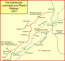 Mineral extraction developed increasingly in the ground to the north of Penicuik, and this led to a proposed railway serving the district; the Edinburgh Loanhead and Roslin Railway Act authorising the line, obtained the Royal Assent on 20 June 1870.[note 1][3] the capital was £54,000.[4] Agreement had been reached with the North British Railway to work the line for thirty years for 45% of gross receipts, and a clause allowed the NBR to purchase the concern within five years of opening.[1][5][6]