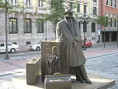 Úrculo's first bronze sculpture was created in 1984, and others soon followed, such as Homenaje a Santiago Roldán ("Tribute to James Roldan", 1993, Barcelona's Olympic Village), El regreso de Williams B. Arrensberg ("The return of Williams B. Arrensberg", 1993, Oviedo), and Exaltación de la manzana ("Exaltation of the apple", 1996, Villaviciosa). Perhaps his best-known bronze sculpture is El Viajero (Local Asturian dialect for "The Traveller") - the same (1993) piece described earlier by its formal name, "The Return of Williams B. Arrensberg". Now in the middle of a square, in the heart of Oviedo (Asturias) one can find our returning traveler, with bags, coat, and umbrella.
