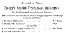 In England in 1888, they billed themselves as "The Zerega Spanish Troubadours", consisting of "two on mandolin and guitar, with tambourine, castanet and fairy-bell accompaniments", appearing at the Royal Albert Hall, West Theatre.[10] They also toured as "Zerega's Spanish Minstrels".[2] On 17 and 21 August 1895, "These famous Mandoline and Guitar Players, Singers, and Dancers had the honour of appearing before her Majesty the Queen [Victoria] [at] Osborne House",[11] and performed the following programme:[12]