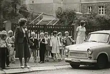 The majority of East German parents (85%) worked outside of the home which resulted in a significant need for childcare services throughout the country. Children up to the age of three attended state run crèches (Kinderkrippen) which were often situated next to kindergarten buildings. Throughout the history of East Germany, young women would serve or volunteer in crèches in order to have more of an influence in raising their children.[1]