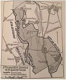 After its preliminary training the Division entered the line on July 16, where it remained almost continuously until the end of October. In that time it was in the actual battle from 30 August, and took part in the Ypres-Lys and Somme offensives. On September 29, the Division broke through both the Hindenburg and the Le Catlet-Nauroy lines, capturing Bellicourt and Nauroy, an operation on which all subsequent action of the 4th British Army depended. From October 7 to October 20, the Division advanced 23 kilometers in a continued series of attacks, capturing 2,352 of the enemy. Brancourt, Premont, Busigny, St. Benin, St. Couplet and Escaufort, La Haie Mineresse, and Vaux Andigny are names which will live in the memories of those who fought in the 30th Division. But its especial glory will always be the honor you won by breaking the Hindenburg Line on September 29. Such a record is one of which we are all proud.