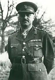 In 1914, during World War I, at the age of 17, Edwin William Conquest Flavell enlisted in the East Surrey Regiment and was commissioned as a second lieutenant five months later. In 1916 he transferred to the newly formed Machine Gun Corps, and in 1917 he was believed to be the youngest major serving in the Flanders area at the age of 20.[1] He was wounded during the Battle of Cambrai in the same year, and by the end of the conflict had been awarded the Military Cross a total of three times (referred to as the Military Cross and two Bars). The first was awarded for taking command of an infantry company that had lost all of its officers; by his leadership the unit was able to continue advancing. The second (his first bar) was for conducting several personal reconnaissances of enemy positions.[1] In mid-March 1918, Flavell was transferred from the 19th (Western) Division to the 42nd (East Lancashire) Division, where he took command of the 126th Machine Gun Company; one of the officers in the company was his future commanding officer, Lieutenant (later general) Richard Nelson Gale.[9]