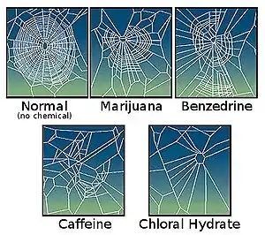 In 1948, Swiss pharmacologist Peter N. Witt started his research on the effect of drugs on spiders. The initial motivation for the study was a request from his colleague, zoologist H. M. Peters, to shift the time when garden spiders build their webs from between 2:00 a.m. and 5:00 a.m., which was decidedly inconvenient for Peters, to earlier hours.[4] Witt tested spiders with a range of psychoactive drugs, including amphetamine, mescaline, strychnine, LSD, and caffeine, and found that the drugs affect the size and shape of the web rather than the time when it is built. At small doses of caffeine (10 µg/spider), the webs were smaller; the radii were uneven, but the regularity of the circles was unaffected. At higher doses (100 µg/spider), the shape changed more, and the web design became irregular. All the drugs tested reduced web regularity except for small doses (0.1–0.3 µg) of LSD, which increased web regularity.[2]