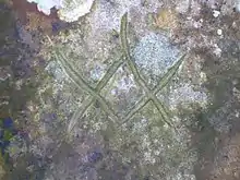 A highly unusual landscape feature of some considerable size was laid out as a bilaterally symmetrical design near Benslie hamlet and is shown on the 1750s Roy map. It lies outside the ornamental woodlands and has the 'appearance' of the foundations of a large building, although it was made up of trees.[5] 55°39′0.8″N 4°38′37.7″W / 55.650222°N 4.643806°W This odd shaped park or 'baroque park' feature has similarities to a 'Celtic' cross shape, a topographical feature mapped by Roy's surveyors. It may be a small deer hunting park or baroque garden layout possibly similar to one that existed at the Optagon Park, Alloa Estate, Clackmannanshire; which in turn was after the Dutch taste and modelled on Hampton Court, the favourite home of King William; a Dutchman.[45][46] On the 1938 OS map the Montgreenan side of Benslie wood retains the shape of that part of the baroque garden. It is possible that this area was incomplete when mapped by Roy in the 1750s.