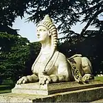 Sphinx were used as decorative features, often on houses or surmounting gate piers from the 18th. century onwards. Possibly the earliest use of the Sphinx as a motif is as a support for a 17th. century sundial in the grounds of Newbattle Abbey in Midlothian, Scotland. In the 1730s Lord Burlington and William Kent introduced sphinx and other Egyptian elements into the gardens at Chiswick House. This was followed by James Playfair who used them as decorative features on Cairneess House, A pair of Sphinx were also used by James Bateman in his Egyptian Garden, which he created at Biddulph Grange in the 1840s.