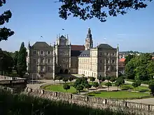 In the 19th century, Ernst I had the palace redesigned by Karl Friedrich Schinkel in English Gothic Revival style, beginning in 1810.[1] Most of the work took place between 1816 and 1840, with the palace façade clothed in sandstone.[2]: 27