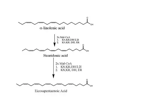 The proposed polyketide synthesis pathway of EPA in Shewanella is a repetitive reaction of reduction, dehydration, and condensation that uses acetyl coA and malonyl coA as building blocks. The mechanism of α-linolenic acid to EPA involves the condensation of malonyl-CoA to the pre-existing α-linolenic acid by KS. The resulting structure is converted by NADPH dependent reductase, KR, to form an intermediate that is dehydrated by the DH enzyme. The final step is the NADPH-dependent reduction of a double bond in trans-2-enoly-ACP via ER enzyme activity. The process is repeated to form EPA.[19]
