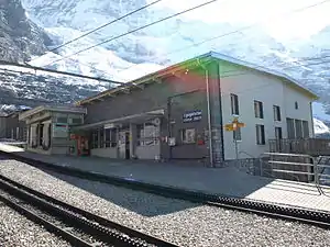 Eigergletscher is a railway station in the municipality of Lauterbrunnen in the canton of Bern. The station is served by trains of the Jungfrau railway, which run to the Jungfraujoch from Kleine Scheidegg, where they connect with services from Interlaken, Lauterbrunnen, Wengen and Grindelwald via the Bernese Oberland railway and the Wengernalp railway.[1][2][3]