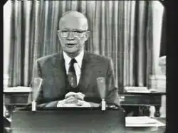 Eisenhower's farewell address (sometimes referred to as "Eisenhower's farewell address to the nation"[1]) was the final public speech of Dwight D. Eisenhower as the 34th President of the United States, delivered in a television broadcast on January 17, 1961. Perhaps best known for advocating that the nation guard against the potential influence of the military–industrial complex, a term he is credited with coining, the speech also expressed concerns about planning for the future and the dangers of massive spending, especially deficit spending, the prospect of the domination of science through federal funding and, conversely, the domination of science-based public policy by what he called a "scientific-technological elite".[2] This speech and Eisenhower's Chance for Peace speech have been called the "bookends" of his administration.[3]