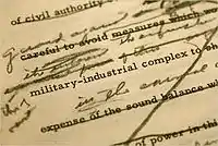 As early as 1959, Eisenhower began working with his brother Milton and his speechwriters, including his chief speechwriter Malcolm Moos, to develop his final statement as he left public life. It went through at least 21 drafts.[6] The speech was "a solemn moment in a decidedly unsolemn time", warning a nation "giddy with prosperity, infatuated with youth and glamour, and aiming increasingly for the easy life."[3]