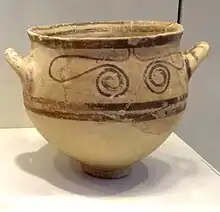 In the Strata VI–V Philistine 2 (Bichrome) pottery with red and black decoration on white slip is a major part of the ceramic assemblage. The material culture of Stratum IV is characterized by Philistine 3 (debased) pottery and the influence of a ceramic tradition of predominantly red-slipped and burnished ware.