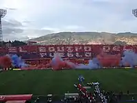 Atlético Nacional is one of the most supported clubs in the country, with a large percentage of their supporters coming from other parts of the country. Whilst Independiente Medellín does not have as much support, it is well supported throughout the city, especially in the comunas, which is why it is often referred to as "El Equipo del Pueblo" (the people's team).[4] Their fans are characterized as very loyal, due to the long trophy droughts the club has been through, and they usually create large tifos before derby matches.[5][6][7] Independiente Medellín was one of the clubs with the most ticket sales in 2022, despite not being a "big" club with lots of history and success, beating other more popular clubs such as América de Cali and Millonarios and only falling short to their crosstown rivals Nacional.[8][9]