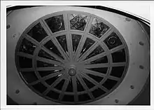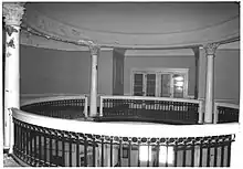 The interior of the building is two stories high with wooden steps leading to the upper floors. Construction is mainly concrete plaster walls with concrete floors. The center of the building is graced by a three-story rotunda with ornate stained glass at the top. On the second floor is a circular balcony that overlooks the main floor lobby and provides a beautiful view of the stained glass ceiling. There are many side rooms on all the floors with many exterior windows that provide a panoramic view of the building grounds and the surrounding area. In addition, French style doors lead from the second floor onto balconies on the north and south sides of the building.[4]