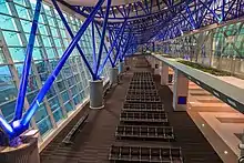 The platform of Passenger Terminal 1 Building has fourteen aircraft parking positions with respective boarding bridges, which connect the aircraft directly to the waiting rooms. The platform of Passenger Terminal 2 Building has five aircraft parking positions with their respective boarding bridges. One of the positions has double boarding bridges for widebody aircraft. Three remaining positions are "remote", i.e., passengers who disembark at any of them are transferred to the terminal through aerobuses. The remote gates are used mostly by turboprop aircraft. The runway is capable of handling landings and takeoffs by Boeing 747 and Boeing 777 aircraft. Taiwan's President Tsai Ing-wen made an official diplomatic tour of Central America in an Eva Air B777-300ER aircraft.