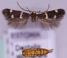 The wingspan is 10–11 millimetres (0.39–0.43 in). The moth flies from June to August depending on the location.[1] The head is light ochreous-yellow, seldom with a fuscous spot. Forewings are dark fuscous ; a somewhat oblique fascia before middle, a smalltornal spot, and another on costa beyond it ochreous-whitish, in female enlarged and more conspicuous. Hindwings are blackish grey.The larva is pale yellow ; head pale brown.[2]
