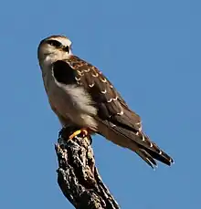 The black-winged kite was described by the French naturalist René Louiche Desfontaines in 1789 and given the binomial name Falco caeruleus.[2][3] It is now one of four species in the genus Elanus which was introduced in 1809 by the French zoologist Jules-César Savigny.[4] The genus Elanus is distinctive in having very small scales covering the foot and on the underside, scutellate scales are found only under the terminal phalanges. The claw lacks a groove on the underside.[5] The word Elanus is from Ancient Greek elanos for a "kite". The specific epithet caeruleus is the Latin for "blue".[6]