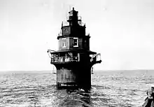 The light was struck glancing blows by passing ships several times over the years.[2] A story on December 19, 1954, Philadelphia Evening Bulletin recalled that the keepers slept in life jackets for fear of having to abandon the station should it be struck.[3] This precaution proved unnecessary, but only because damage from a storm in November 1951 had resulted in sufficiently serious damage that the light was automated, controlled by the keepers of the Miah Maull Shoal Light to the south. On October 20, 1953, however, the Isthmian Lines' ore freighter Steel Apprentice, navigating in thick fog and without operable radar, struck the light head-on, knocking most of the house into the bay. The coast guard removed the wreckage and erected a steel skeleton tower on the old foundation.[2][3] This light remains in service.[1]