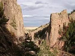 Ute Indians were the first inhabitants into this area that is nestled against the foothills near Boulder. The Indians lived within the walls of the canyon because they provided protection from the harsh Colorado winters. Settlers soon followed in search of gold and agriculture.[3] Eldorado Canyon is known for its geologic history dating back billions of years. Near the park's entrance at the visitors center, there are rocks calculated to be over 1.5 billion years old.[3]