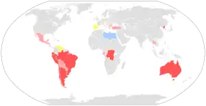 The other main form of majoritarian system is the two-round system, which is the most common system used for presidential elections around the world, being used in 88 countries. It is also used in 20 countries for electing the legislature.[1] If no candidate achieves a majority of votes in the first round of voting, a second round is held to determine the winner. In most cases the second round is limited to the top two candidates from the first round, although in some elections more than two candidates may choose to contest the second round; in these cases the second round is decided by plurality voting. Some countries use a modified form of the two-round system, such as Ecuador where a candidate in the presidential election is declared the winner if they receive 40% of the vote and are 10% ahead of their nearest rival,[6] or Argentina (45% plus 10% ahead), where the system is known as ballotage.