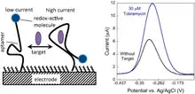 The DNA or RNA aptamers are fixed on the interrogating electrode, where a redox reaction is reported by a redox tag. Gold is often used as the probe surface for interrogating electrodes. The surface of the gold electrode is packed with redox-tagged DNA or RNA aptamers. The redox reporter is often methylene blue.[1] Upon target binding, the aptamer changes structure by folding, bringing the redox reporter closer to the gold electrode. This increase in proximity from the redox-reporter to the electrode enables faster electron transfer from the redox tag to the gold electrode.[3] The increase in speed of electron transfer contributes to a change in Faradaic current that is detected by the potentiostat.