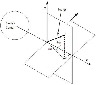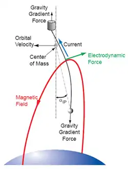 Realistically, the transverse electrodynamic forces cause the tether to bow and to swing away from the local vertical. Gravity gradient forces then produce a restoring force that pulls the tether back towards the local vertical; however, this results in a pendulum-like motion (Gravity gradient forces also result in pendulous motions without ED forces). The B direction changes as the tether orbits the Earth, and thus the direction and magnitude of the ED forces also change. This pendulum motion can develop into complex librations in both the in-plane and out-of-plane directions. Then, due to coupling between the in-plane motion and longitudinal elastic oscillations, as well as coupling between in-plane and out-of-plane motions, an electrodynamic tether operated at a constant current can continually add energy to the libration motions. This effect then has a chance to cause the libration amplitudes to grow and eventually cause wild oscillations, including one such as the 'skip-rope effect',[69] but that is beyond the scope of this derivation. In a non-rotating EDT system (A rotating system, called Momentum Exchange Electrodynamic Reboost [MXER]), the tether is predominantly in the z-direction due to the natural gravity gradient alignment with the Earth.