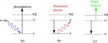where Ekinetic is the kinetic energy of the Auger electron, hν is the energy of the incoming radiation particle and EB is first outer shell binding energy and EC is second outer shell binding energies.[1]
