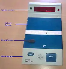 Electronic voting is the standard means of conducting elections using Electronic Voting Machines (EVMs) in India.[1][2] The system was developed and tested by the state-owned Electronics Corporation of India and Bharat Electronics in the 1990s. They were introduced in Indian elections between 1998 and 2001, in a phased manner. Prior to the introduction of electronic voting, India used paper ballots and manual counting. The paper ballots method was widely criticised because of fraudulent voting and booth capturing, where party loyalists captured booths and stuffed them with pre-filled fake ballots. The printed paper ballots were also more expensive, requiring substantial post-voting resources to count hundreds of millions of individual ballots.[2][1] Embedded EVM features such as "electronically limiting the rate of casting votes to five per minute",[1] a security "lock-close" feature, an electronic database of "voting signatures and thumb impressions" to confirm the identity of the voter, conducting elections in phases over several weeks while deploying extensive security personnel at each booth[1] have helped reduce electoral fraud and abuse, eliminate booth capturing and create more competitive and fairer elections.[3][2] Indian EVMs are stand-alone machines built with Write once read many memory.[4] The EVMs are produced with secure manufacturing practices, and by design, are self-contained, battery-powered and lack any networking capability. They do not have any wireless or wired internet components and interface.[5] The M3 version of the EVMs includes the VVPAT system.[4]